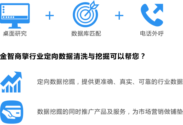 通过与金智800万数据库相匹配,并结合桌面研究、外呼等方式,可快速精准的挖掘出行业定向数据,为市场营销提供数据支持。